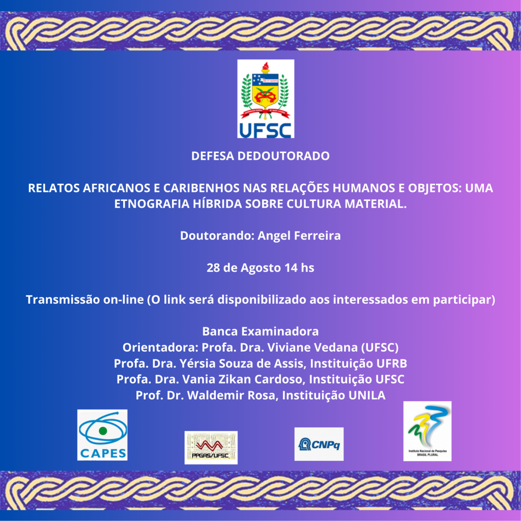 O PPGAS/UFSC (Programa de Pós-graduação em Antropologia Social da Universidade Federal de Santa Catarina) as convida para a defesa de tese de doutorado do discente Angel Ferreira, intitulada: “Relatos africanos e caribenhos nas relações humanos e objetos: uma etnografia híbrida sobre cultura material”.
